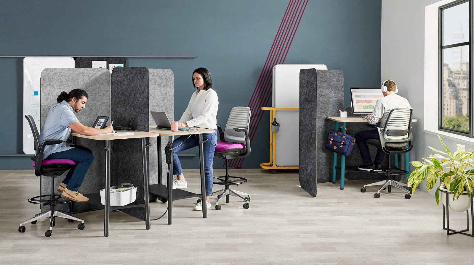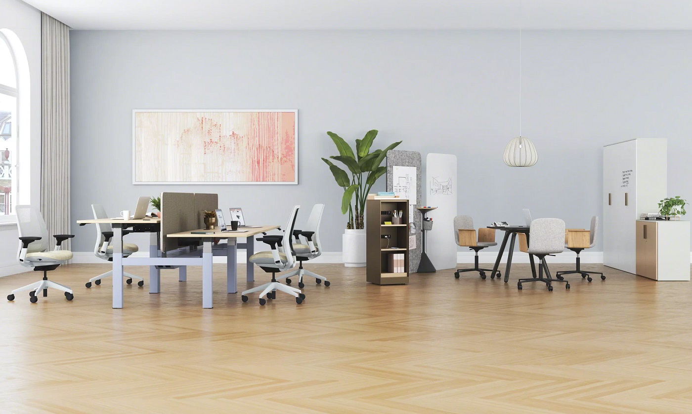 Steelcase Flex bietet eine breite Auswahl an Materialoptionen, die Kreativität und Selbstentfaltung fördern. So können Sie wirklich einzigartige Teamumgebungen gestalten. Die Vielzahl angebotener Furniere, Laminate, Textilien sowie Lux-Pulverbeschichtungen und Lacke sorgt dafür, dass sich Teams nicht nur in der Einrichtung, sondern auch in ihrem Arbeitserlebnis wiederfinden.