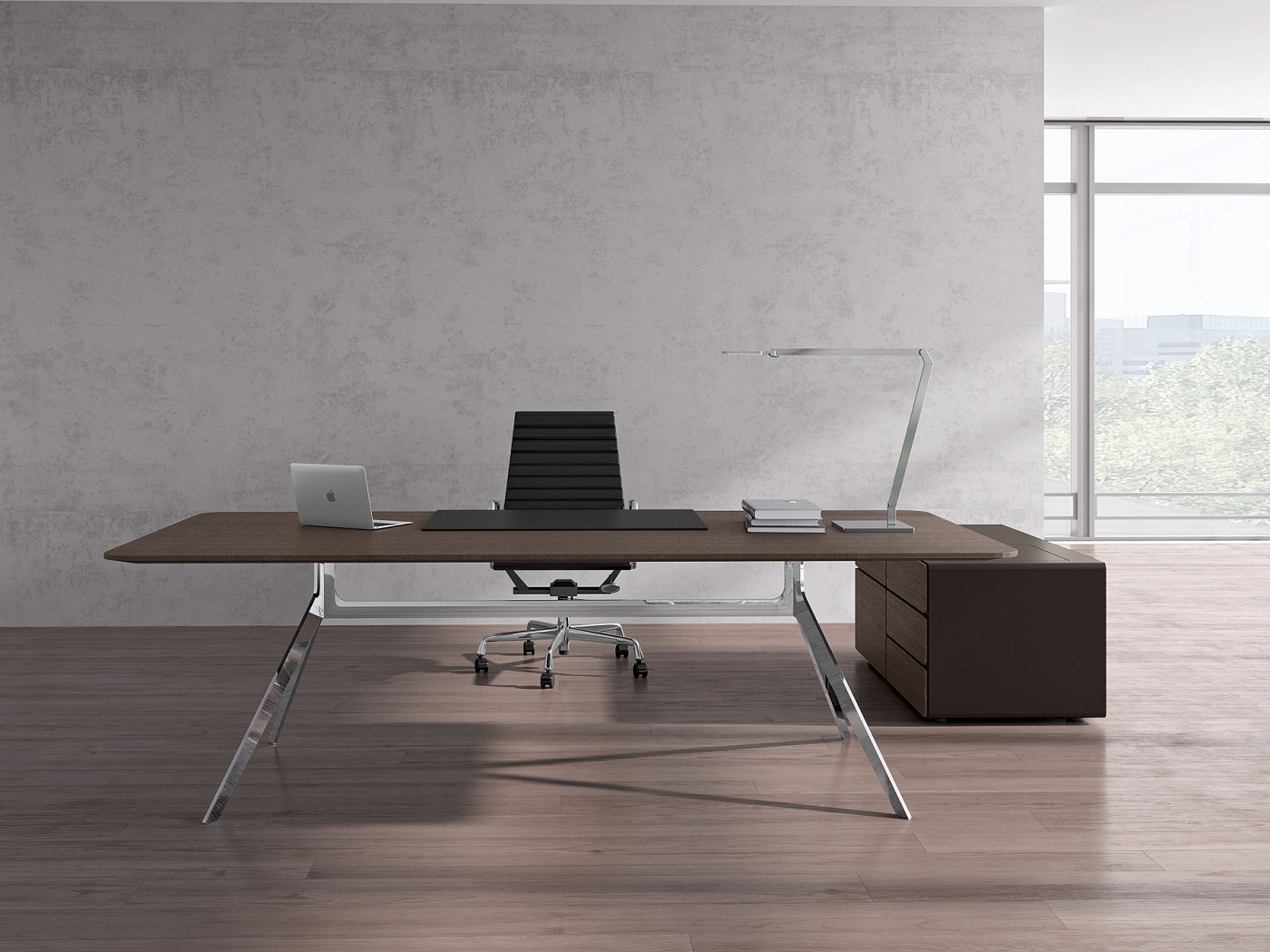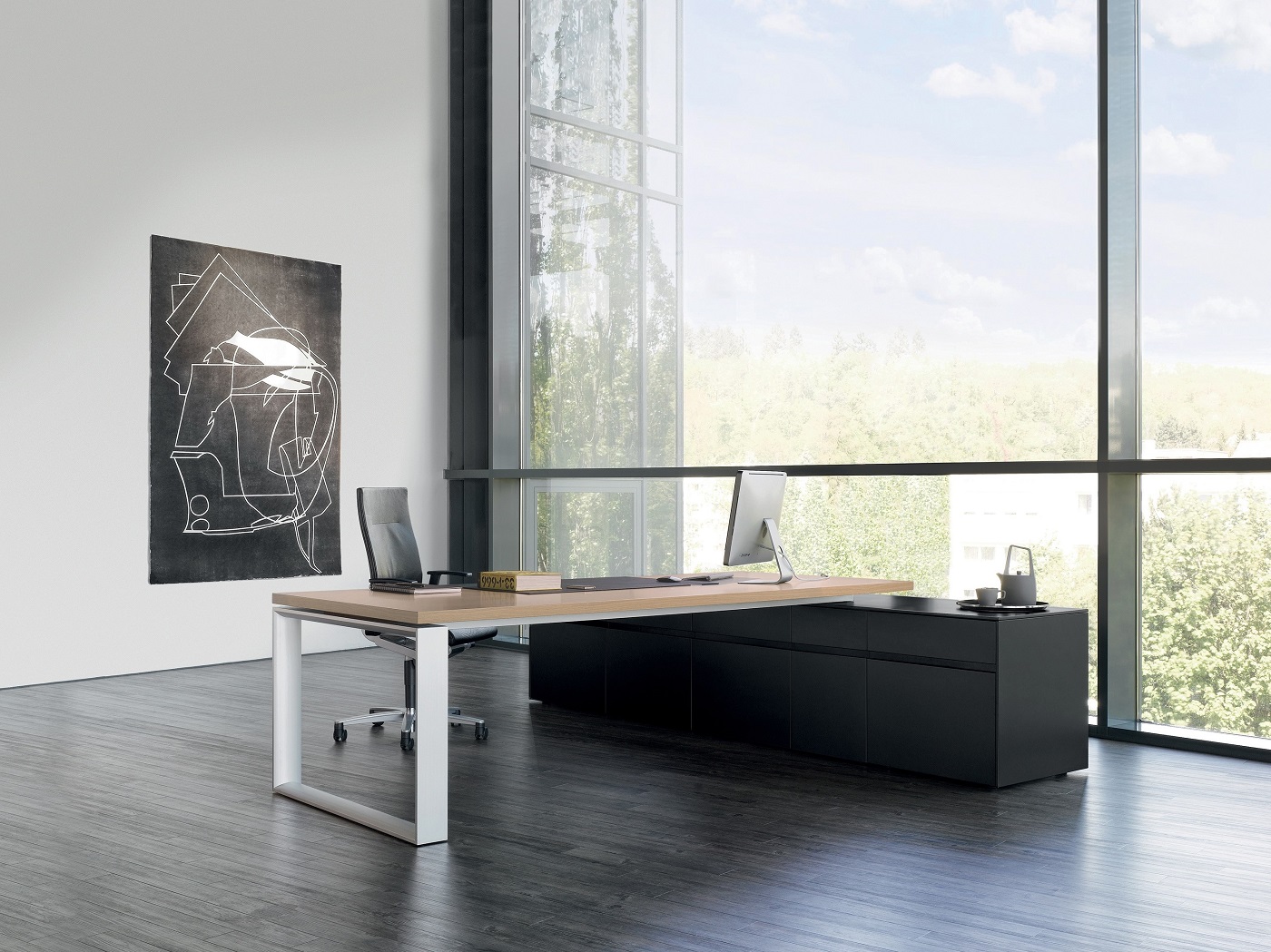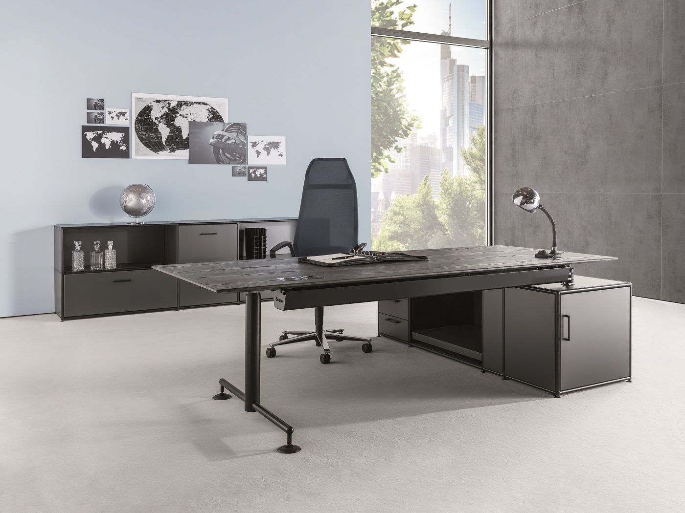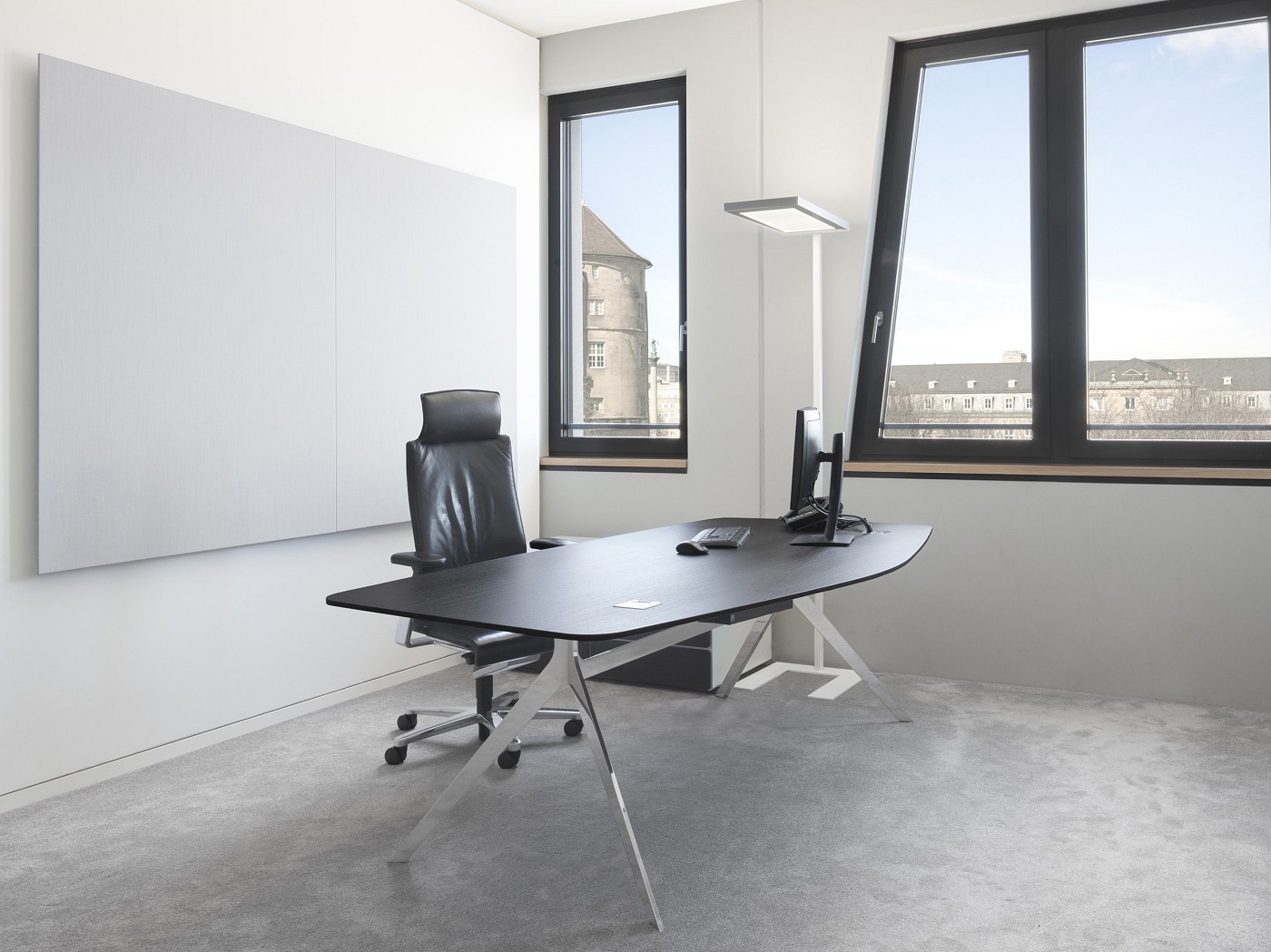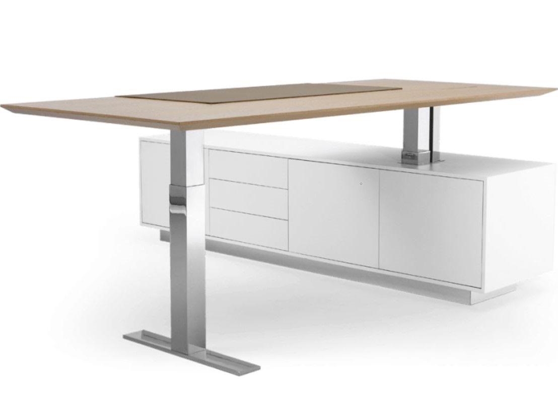 Längs furniert ruht sie auf einem eleganten Fußgestell in exklusivem Design. Mit der Tischauflage und dem Kabelkanal aus Filz vereinen sich kalte und warme Materialien. Die beiden runden Taster für die motorische Höhenverstellung sind flächenbündig in die Oberfläche eingelassen.