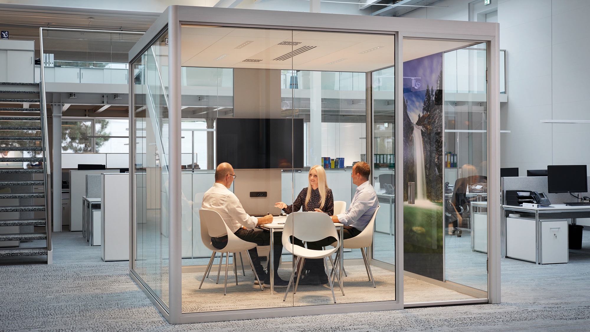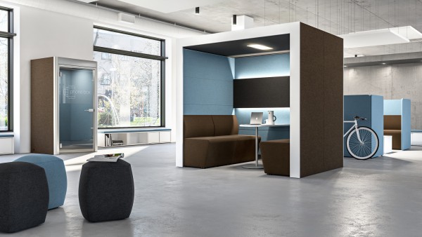 Kommunikationszone neu gedacht und geschmackvoll abgerundet. Für Besprechungen, ruhige Gespräche, entspannte Atmosphäre und kreativen Gedanken-austausch. Wählen Sie aus geschlossenen oder teiloffenen Cubes der Serie SYNEO von ASSMANN. In Ruhe telefonieren, während ...